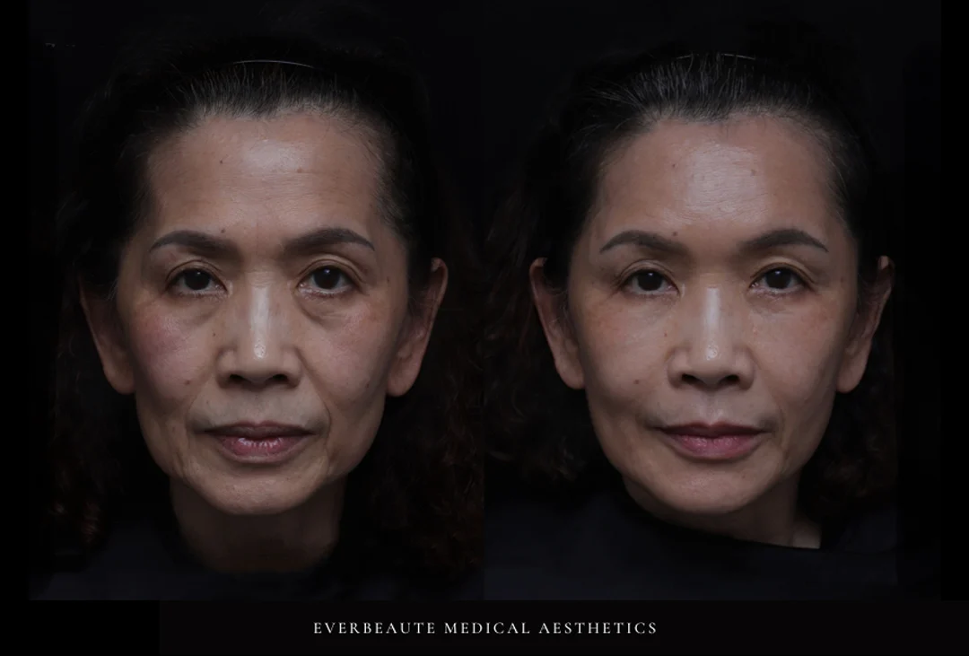 這位女士是曾繁聞醫師在世界美容醫學大會亞太區年會AMWC APAC演講教學案例。她的臉部有嚴重的凹陷和鬆弛下垂: