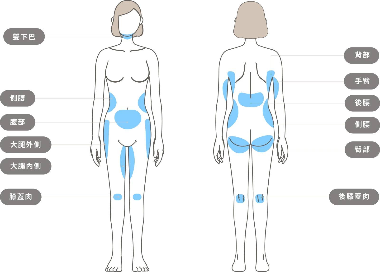 適合改善 手臂蝴蝶袖、大腿內外側(馬鞍肉)、小腹贅肉、腰間肉、雙下巴 等局部脂肪線條。這項技術已獲美國 FDA 歐盟CE與台灣 TFDA 核准,透過專利冷卻機制,使脂肪細胞凋亡並逐漸代謝,達到安全且持久的體態雕塑效果。