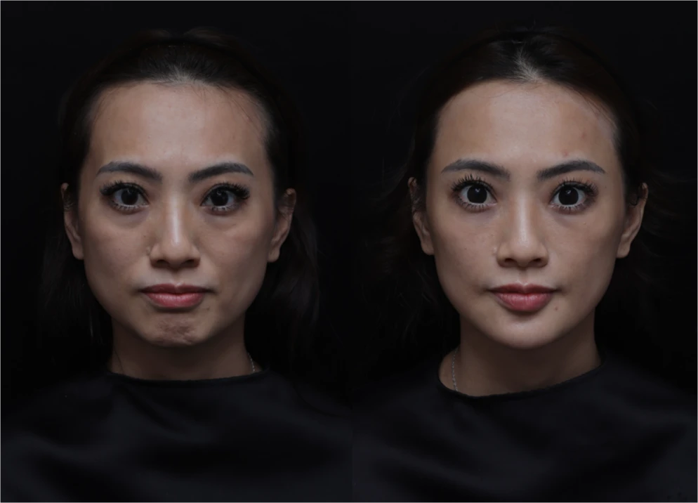 原本的側臉頰凹陷,下顎骨寬闊,造成顴骨以下輪廓剛硬、稜角過多。曾繁聞醫師使用支撐力中等、兼具持久性與柔軟度的玻尿酸改曬凹陷。1並且使用肉毒素修飾了臉型寬度、但這不同於一般瘦臉針,可以避免造成臉頰過度的凹陷,只達到線條柔化的效果。
